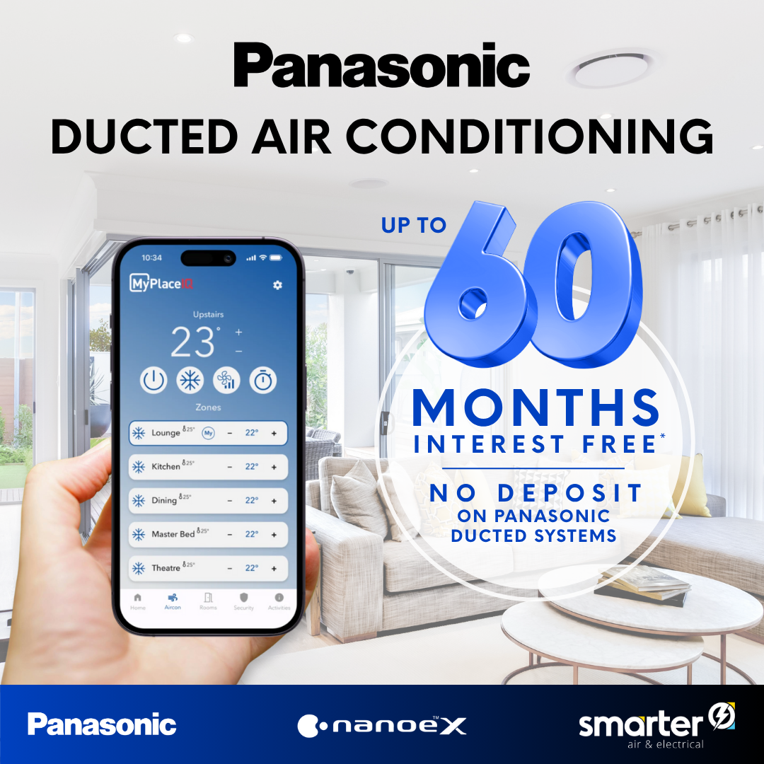 *Disclaimer: Offer available 22/10/2025–30/03/2026 for eligible Panasonic Ducted systems purchased through Smarter Air & Electrical. No deposit, 0% interest for 60 months with minimum finance amounts of $2,300 (60 months). Domestic residence applications and approved applicants only. Fees, terms and conditions apply, including a $99 annual fee on account opening (or $9.95 monthly fee depending on contract date). Minimum monthly repayments required; if not made on time, interest may apply at humm90 rates. Purchases must be added to your finance account by 5:00pm AEST, 31/03/2026 and installed by 5:00pm AEDT, 30/04/2026. Credit provided by humm Cards Pty Ltd (see humm90 for current fees, charges and interest rates). Wholesale excluded from finance offer.